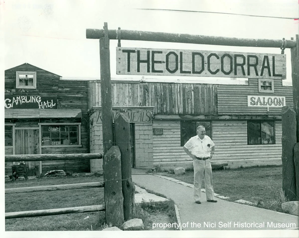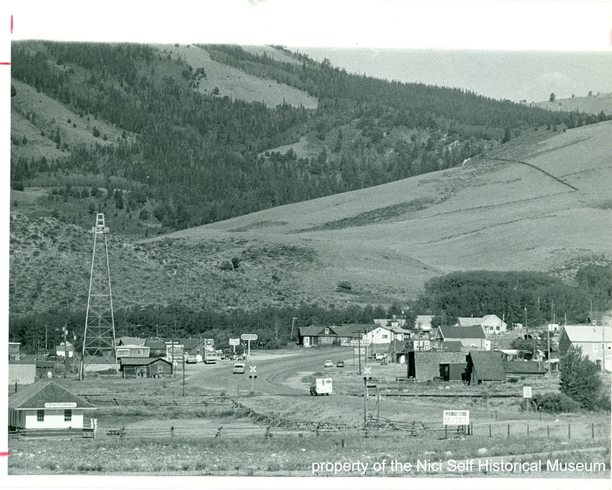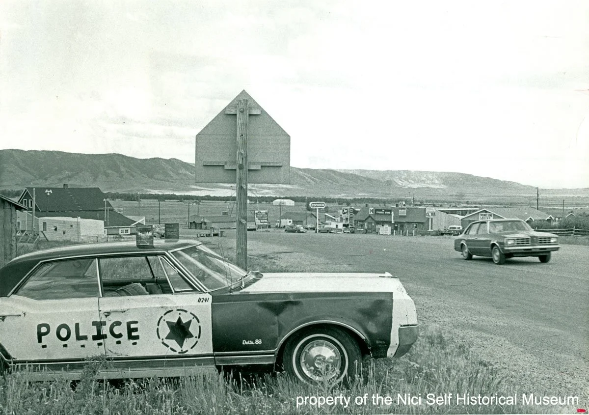 The photos show downtown Centennial, complete with the old tower; Pat Self standing in front of the Old Corral; Mr & Mrs Dave Vanberg; and the 1981 version of Centennial’s famous “police force” parked on the north side of the highway.